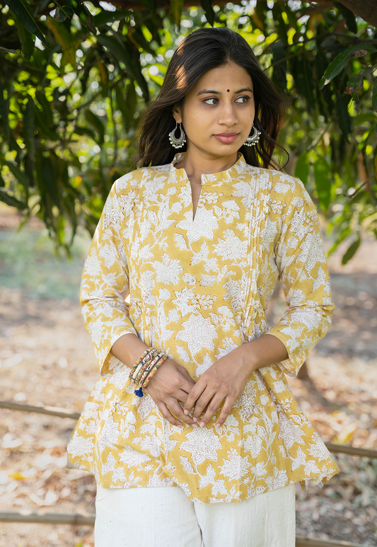Aks Yellow Flower Hand Block Print Organic Cotton Short Top